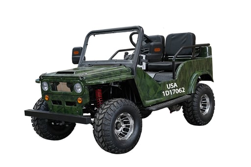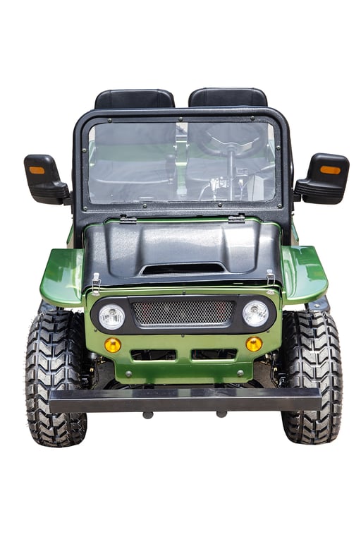 Front and rear wheels, windshield, steering column, seat, spare tire holder, gas can holder, seat bars, seat belts, battery |